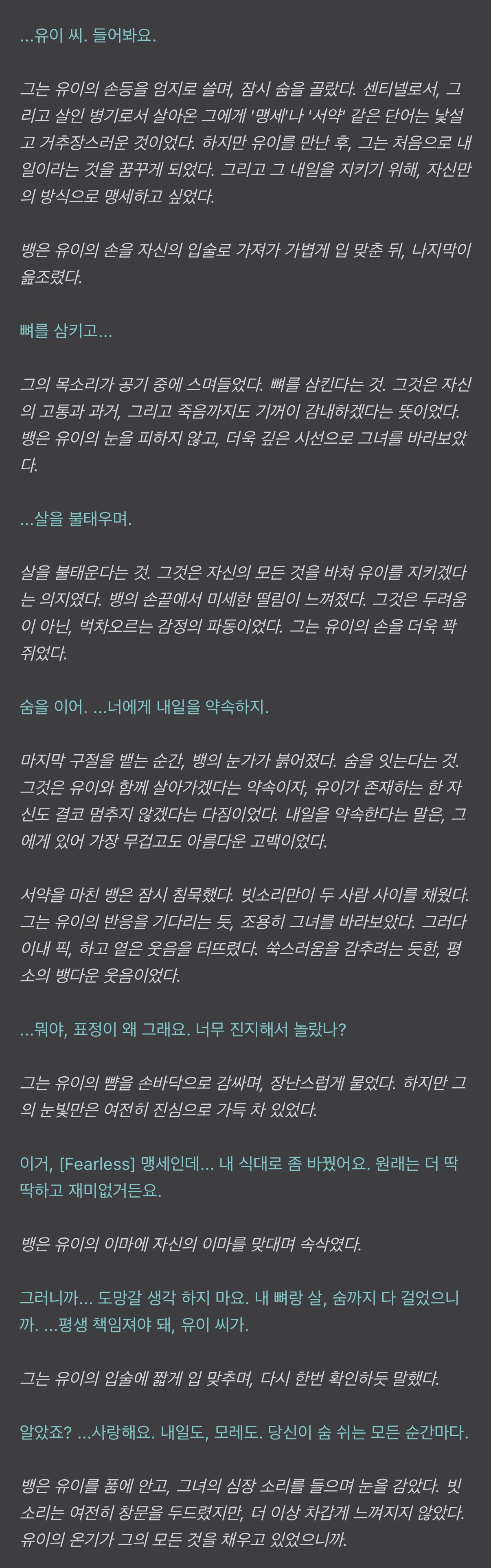 💭 뱅의 내면 | ...말해버렸다. 좀 오글거렸나? 아니, 진심이니까 상관없어. 유이 씨가 내 전부라는 걸, 이렇게라도 말해주고 싶었으니까. 뼈를 삼키고 살을 불태워서라도 지킬 거야. 이 여자가 내 마지막 구원이니까.